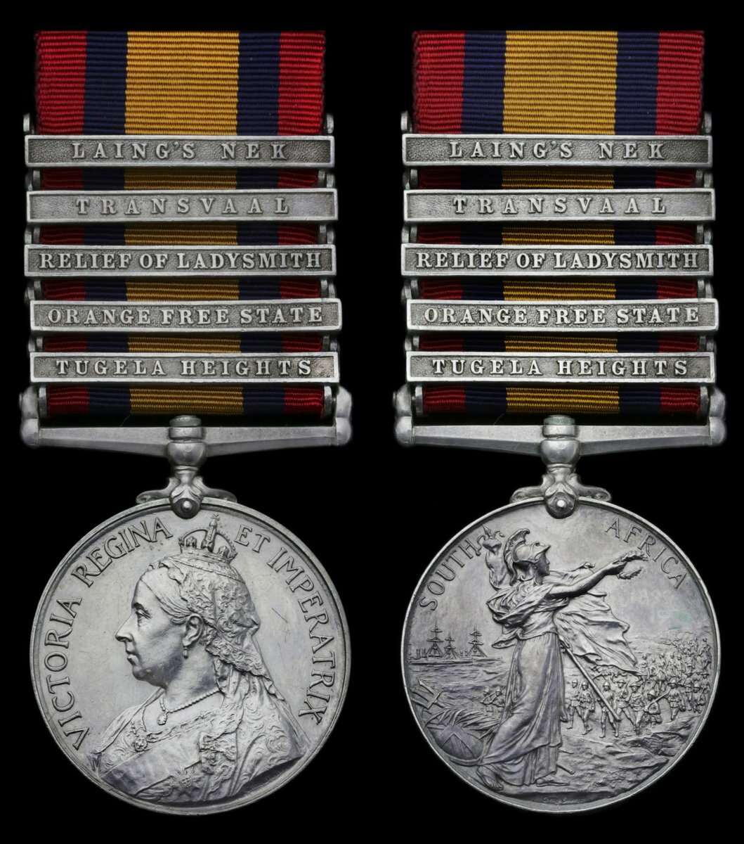 (x) Queen's South Africa 1899-1902, 5 clasps, Tugela Heights, Orange Free State, Relief of Ladysmith, Transvaal, Laing's Nek (3077 Pte. M. Smyth, Rl. Dublin Fus:), number and surname officially re-impressed, very fine