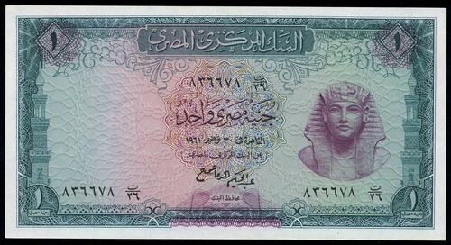 (x) National Bank of Egypt, £1 (4), 1952, 1956, 1957, 1960, purple, blue and multicoloured, Tutankhamen at right, signatures of Ferry, Saad, El Amary and El Refry respectively, also £1 (3), 1961, 1962, 1967, similar to previous