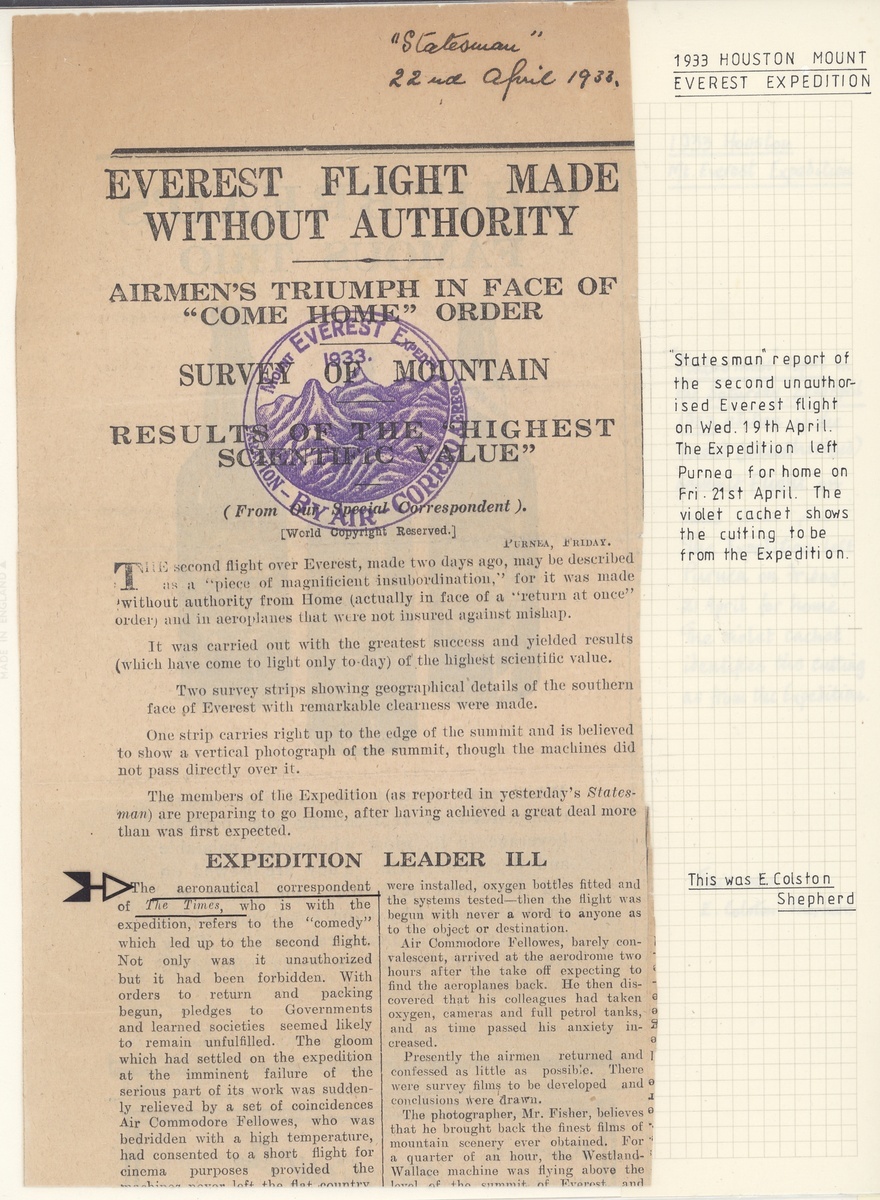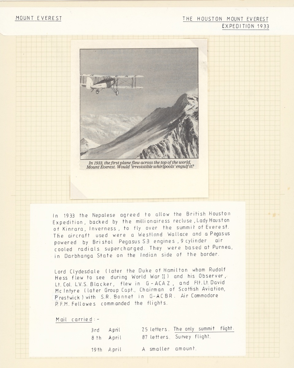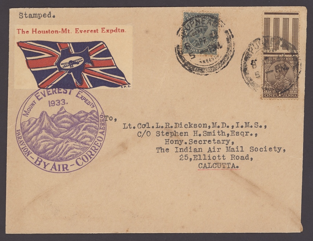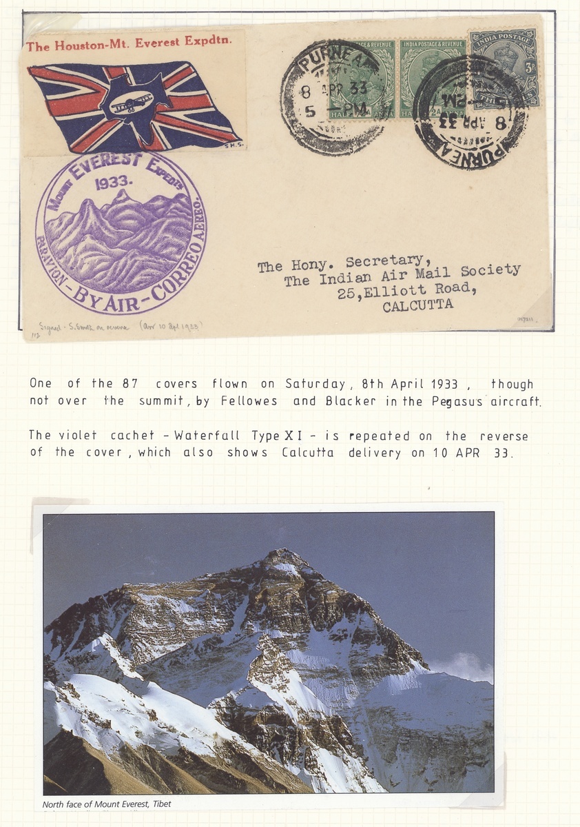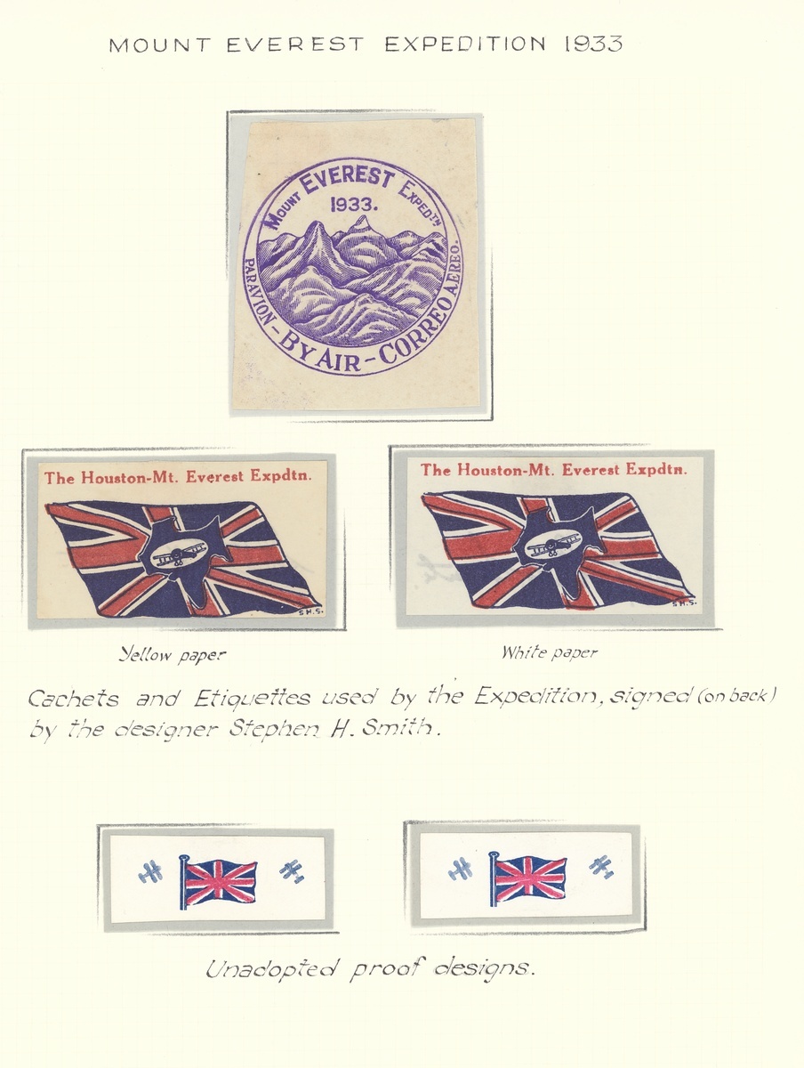 1933 (8 Apr.) Souvenir Flight, a collection with a group of proofs and trials with the expedition label on yellowish and white paper, each with Stephen Smith signature on the reverse, two examples of a smaller, unadopted essay and a strike of the illustrated handstamp on plain paper, two examples of the flown cover, one in a larger format (light toning), various newspaper clippings, five bearing the illustrated handstamp in purple, the booklet 'Nanda Devi' signed by Charles Houston plus other information and photographs. A very interesting lot