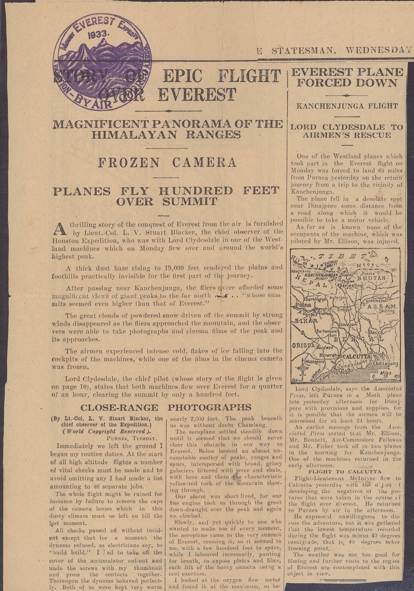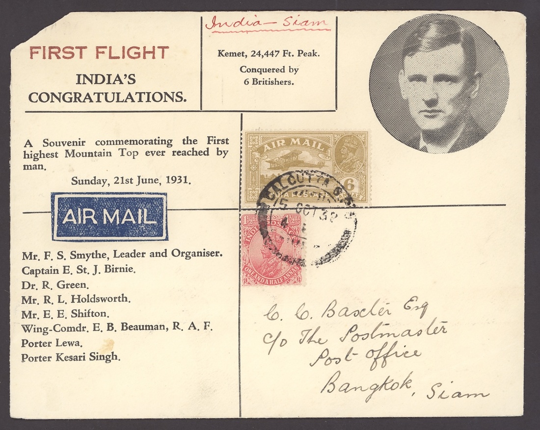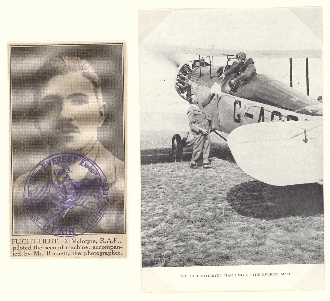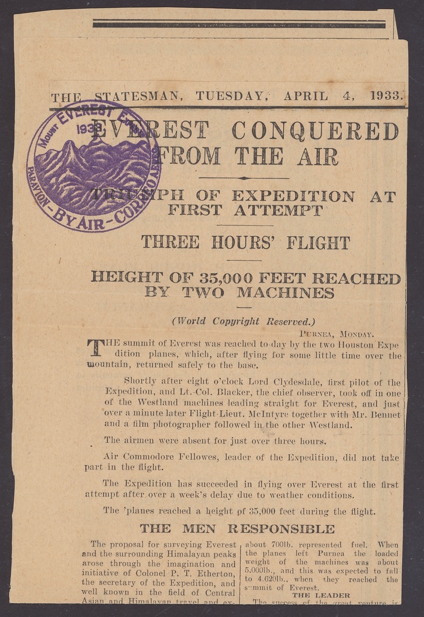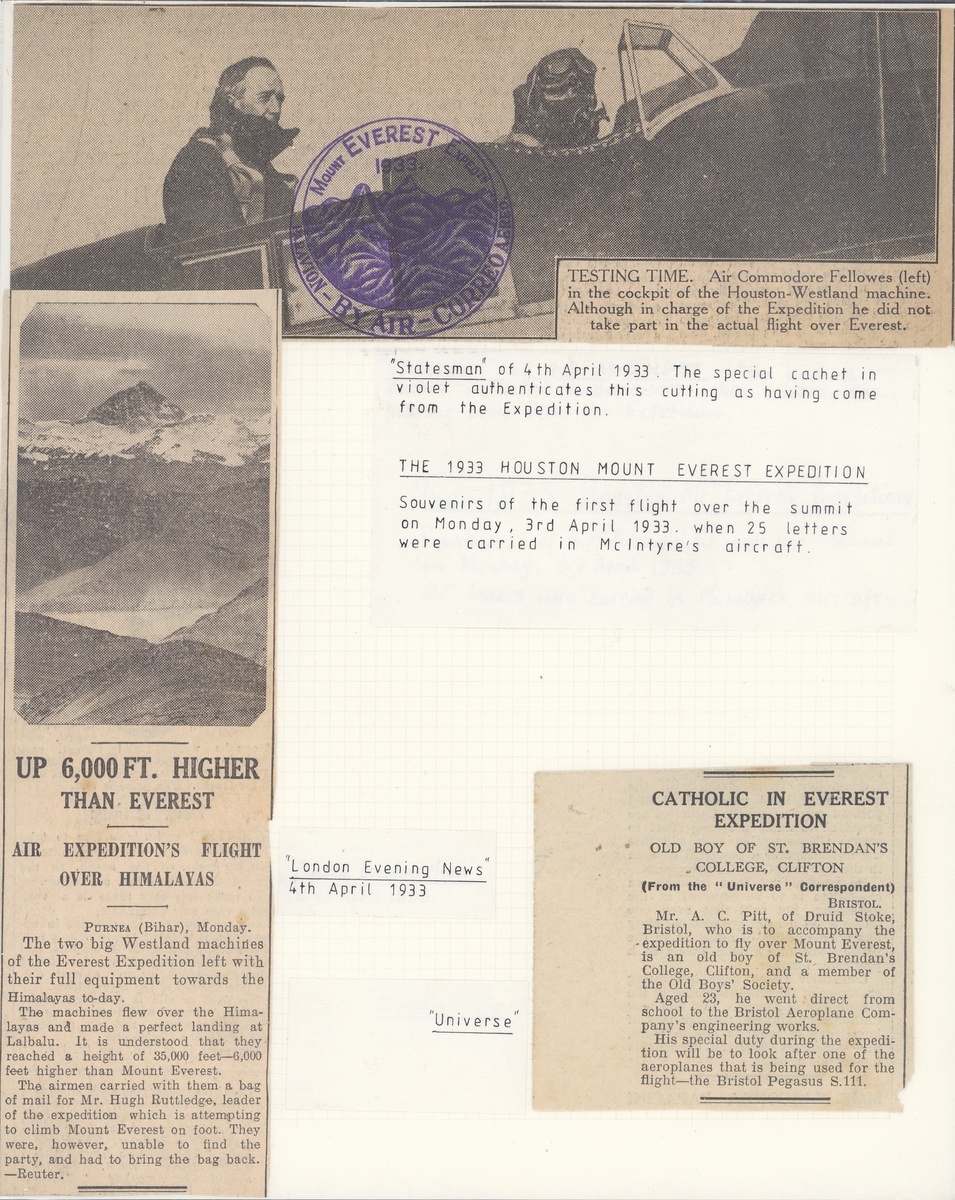 1933 (8 Apr.) Souvenir Flight, a collection with a group of proofs and trials with the expedition label on yellowish and white paper, each with Stephen Smith signature on the reverse, two examples of a smaller, unadopted essay and a strike of the illustrated handstamp on plain paper, two examples of the flown cover, one in a larger format (light toning), various newspaper clippings, five bearing the illustrated handstamp in purple, the booklet 'Nanda Devi' signed by Charles Houston plus other information and photographs. A very interesting lot
