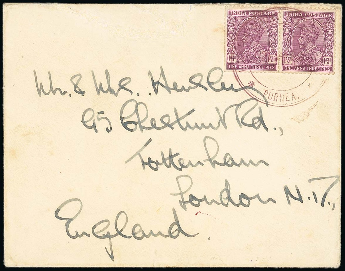 1933 (21 Apr.) envelope from G.F. Hensley to his parents on Tottenham bearing pair of India 1a.3p. tied by a good strike of the special circular Purnea datestamp in mauve, the reverse with Purnea despatch c.d.s. (25.4); clean and fine. This is the last date this postmark was used, Waterfall only records a couple of covers and considers these to be rare. Photo