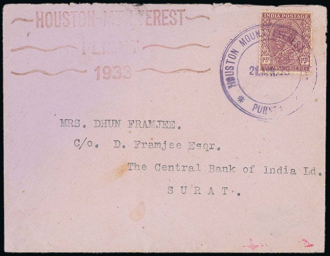 1933 (21 Apr.) envelope to Surat bearing India K.G.V 1a.3p. tied by a fine strike of the special circular Purnea datestamp in purple with the three-line Expedition handstamp alongside (types IX and X), the reverse with Purnea despatch c.d.s. (24.4) and a part of the arrival c.d.s. Clean and fine. Photo