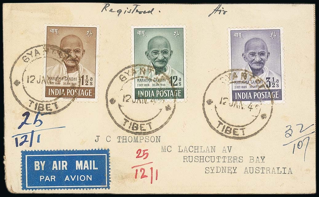 1949 (12 Jan.) envelope sent registered airmail to Sydney bearing Gandhi 1½a., 3½a. and 12a. tied by Gyantse type B5 c.d.s. with the By Air Mail vignette in the lower corner; the reverse with the blue on white registration label with the boxed handstamp type GE. Photo
