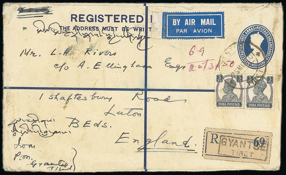 1950 (25 Mar.) India K.G.VI 4½a. registered envelope, opened-out, sent airmail to Luton, uprated 3p. (2) and (on reverse) 4a. (6) cancelled by Gyantse type B5 c.d.s. with the blue on white registration label handstamped type GE; some light creasing and soiling. Photo