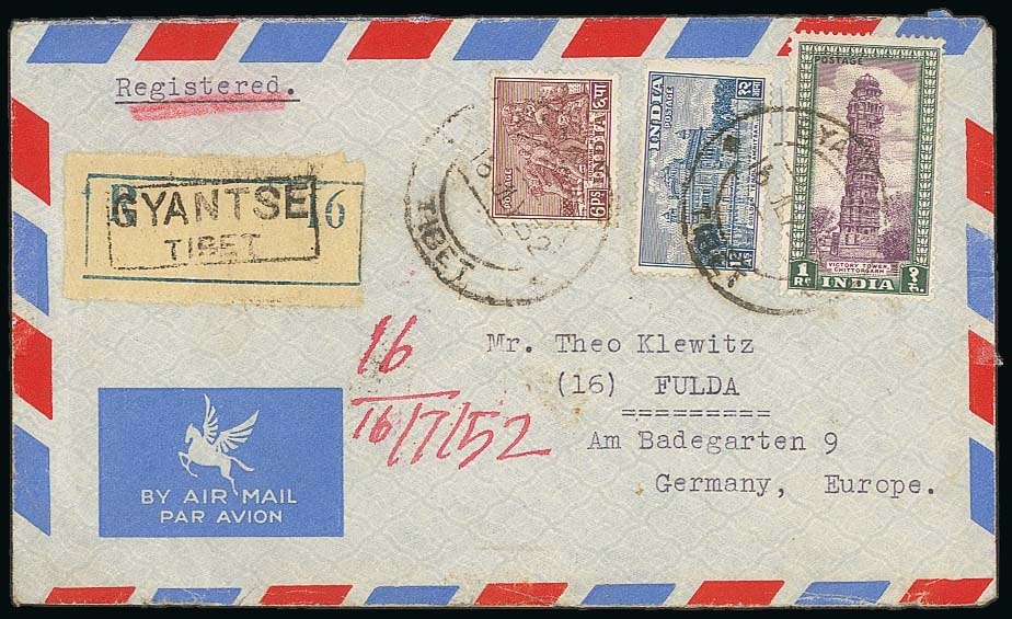 1952 (16 July) airmail envelope to Germany bearing 1r.12½a. franking (1r. with printer's diagonal paper wrinkle) tied by Gyantse type B5 c.d.s. and blue and cream registration label with handstamp type GE, the reverse with Fulda arrival c.d.s. (24.7). Photo