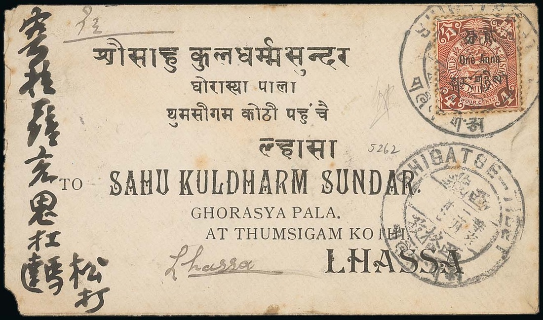 1911 (27 Feb.) printed merchant's letter to Lhassa bearing 1911 1a. on 4c. red (oxidized colour) tied by the type C3 Shigatse c.d.s. with a second strike alongside and, on the reverse, two strikes of the Lhassa type 3 c.d.s. and the merchant's seals in black; some light soiling. Photo