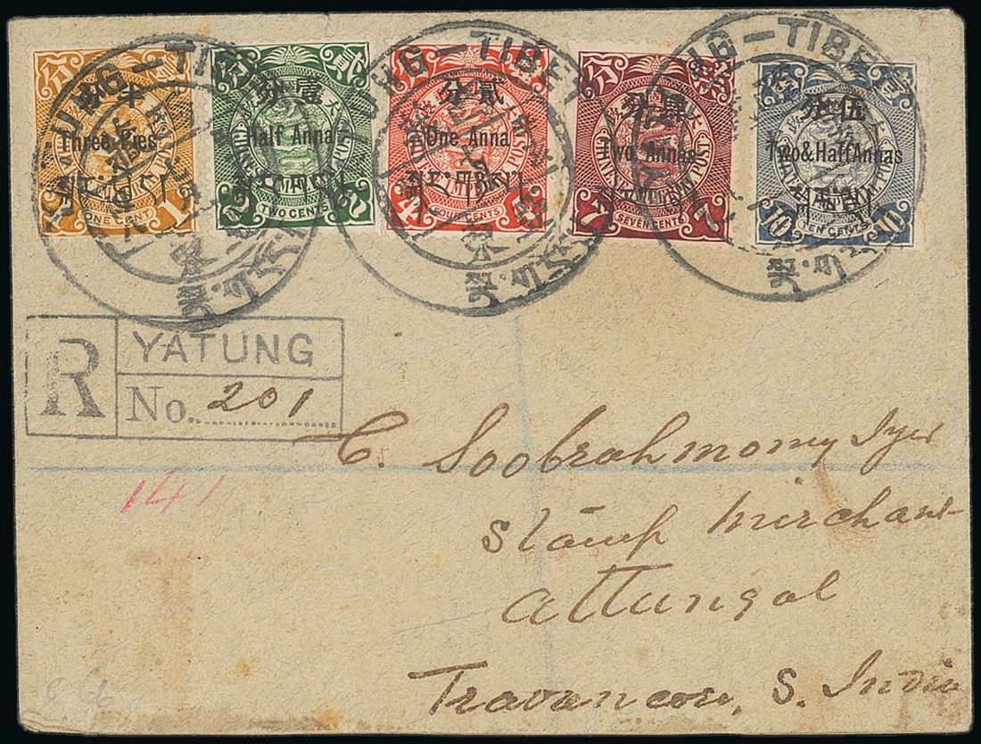 1911 (31 Aug.) envelope registered to Attungol in India bearing 3p. on 1c. to 2½a. on 10c. part set of five tied by superb strikes of Yatung type C3 Dollar dater along with a superb strike of the registration handstamp CR1 (earliest recorded date), the reverse with Attungol arrival (9.9); hinge remainders on reverse, otherwise fresh and fine.