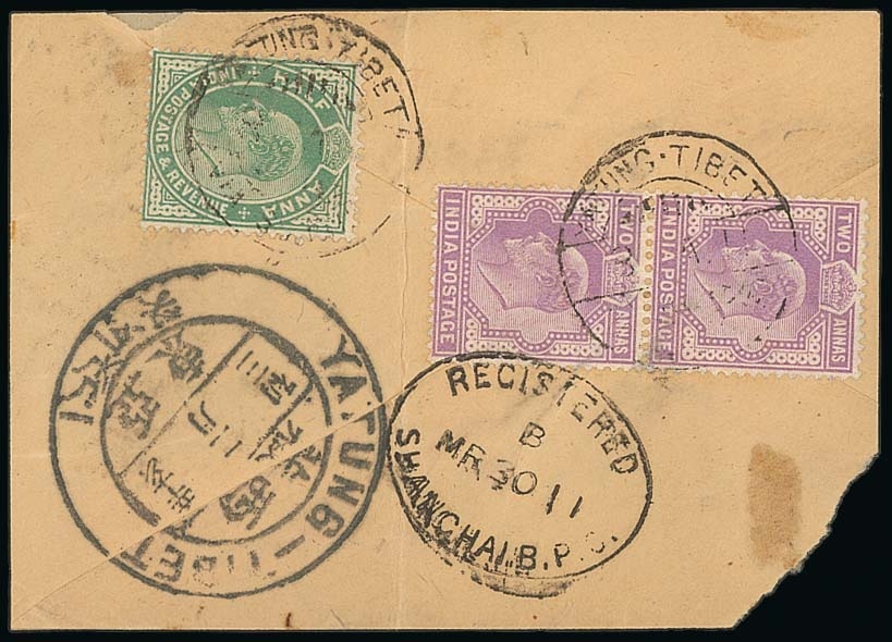 1911 (Feb.) fragment of the reverse of an envelope bearing India ½a. and 2a. (2) tied by "