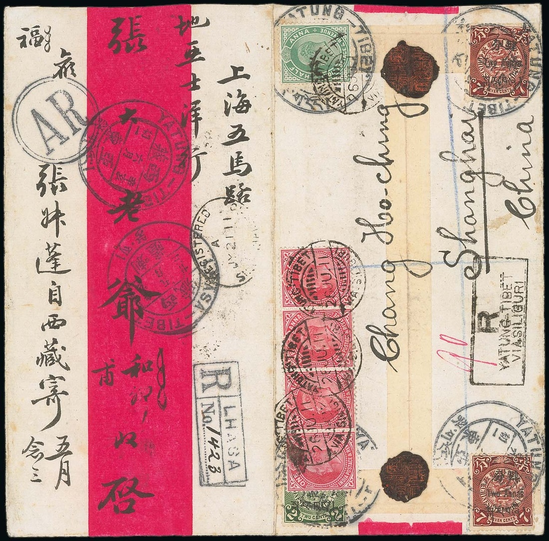 1911年6月23日由拉薩寄上海雙掛號破剖封, 貼1911年壹分蓋於二分票及肆分蓋於七分票 (2), 銷亞東C3 型日戳, 而封正面蓋一7月3日的相似拉薩日戳, 並有方框型掛號戳及蓋大型雙圈 "AR" 印, 信過印度時加貼K.E.VII 1/2a.及1a. (4), 銷清晰 6月26日"Yatung-Tibet/ via Siliburi"日戳, 旁有掛號戳, 同時封上更有7月21日上海英國客郵局㰐圓形掛號到達日期戳. 保存良好, 異常吸引的西藏封.