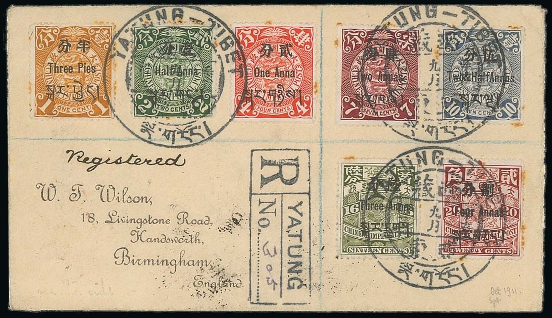 1911年10月28日西藏亞東寄英國伯明翰破剖封, 貼半分蓋於壹分至捌分蓋於貳角票各一枚, 全套十一枚中七枚, 銷較清晰"Yatung-Tibet" C3 型日戳, 旁貼黑白色掛號紙貼 (CR1 型), 封背面加貼印度Q.V. 1/2a. 及2a.6p. 票, 銷"Yatung-Tabet/via Siliguri" B2 型日戳, 並貼大型淺藍色掛號紙貼, 蓋YB 型戳及C3 型調度戳, 11月11日經倫敦並蓋中轉戳. 保存良好.