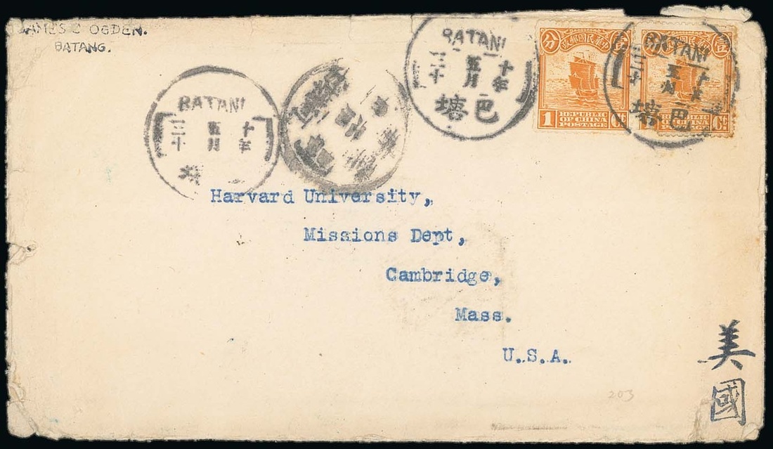 Batang: 1921 (30 May) envelope to U.S.A. from James Ogden of the Tibetan Christian Mission, bearing London print Junk 1c. (2, one with defects) tied by Batang English/Chinese c.d.s. and sent via Atunsze (21.6), Likang (23.6) and Yunnan (6.7). Some soiling at edges, pays the 2c. international printed paper rate. Photo