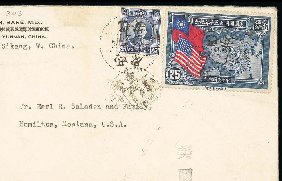Batang: 1940 (10 Feb.) envelope from the Tibetan Christian Mission to Montana, U.S.A. bearing Sun Yat Sen 25c. and 1939 U.S. Constitution Anniversary 25c. tied by dotted Bantang c.d.s. with Chungking (6.3) alongside and, on the reverse, Kanting (22.2), Chengtu (6.3) and Kunming (13.3) c.d.s.; sent via Yunnan