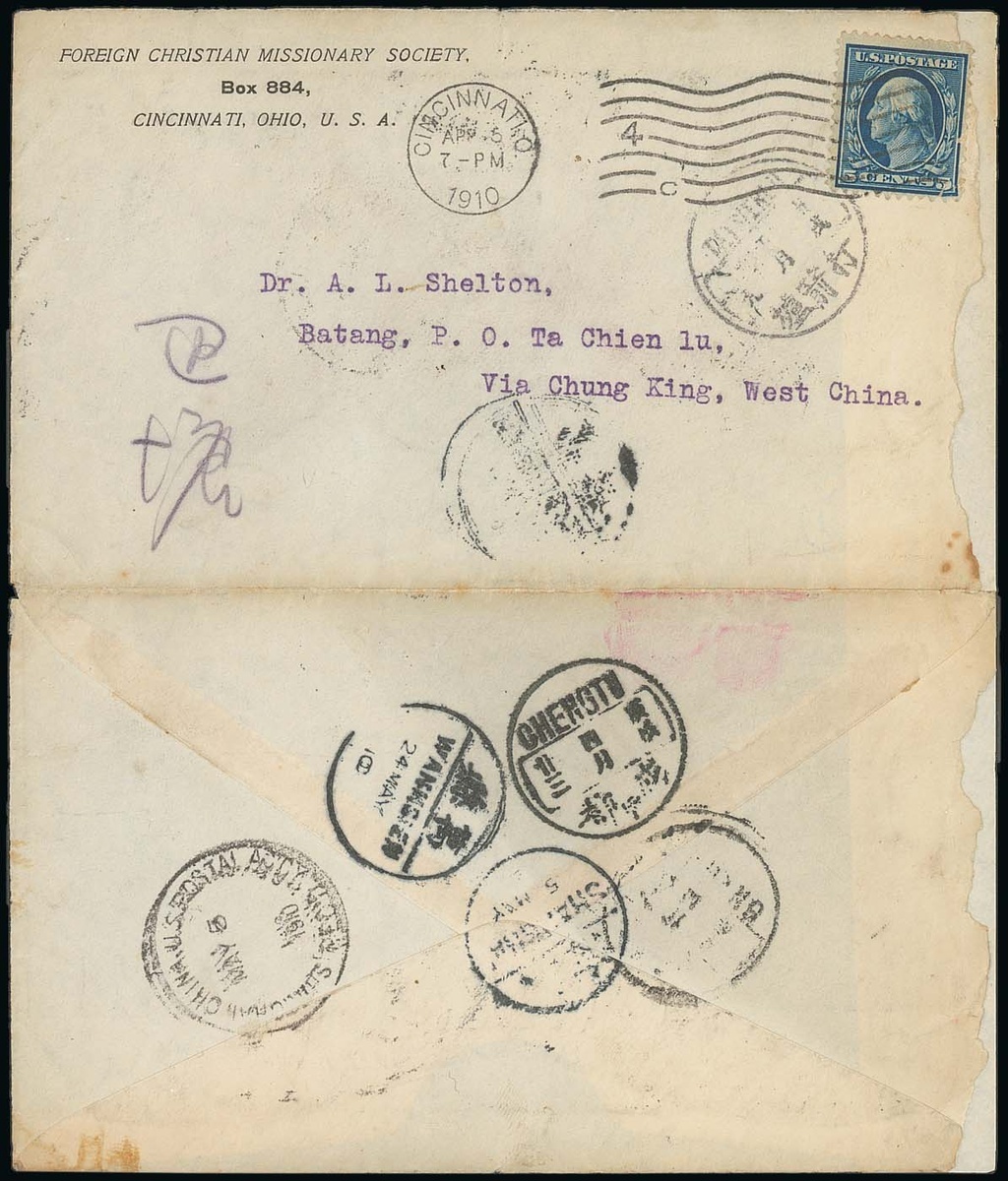 Batang: Incoming Mail: 1910 (5 Apr.) opened-out envelope to Batang bearing U.S. 5c. blue tied by Cincinnati machine postmark and a fine array of Chinese postmarks with U.S. Postal Agency Shanghai c.d.s. (5.5), bilingual Shanghai (5.5), bilingual Wanhsien (24.5), Chengtu (31.5), Tatsinlu (15.6) and Batang. Also a picture post card of Batang. Photo