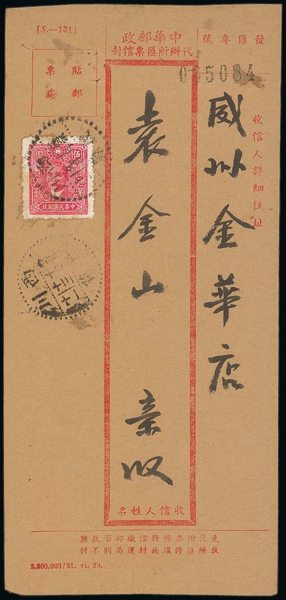 Weizhou Old Town: 1944 (9 Oct.) Postal Agency remittance cover to Weizhou Old Town bearing Sun Yat Sen $5 tied by Maochow type 6.2 dotted c.d.s. with a fair strike of Weizhou Old Town arrival (13.10) alongside (unlisted); some pin holes at top, otherwise fine. Photo