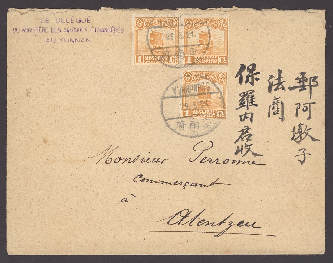Atuntse: 1924 (29 May) envelope from the Belgian Legation in Yunnan to Atuntse bearing 1c. Junk (3) tied by Yunnanfu English/Chinese c.d.s. and with the arrival c.d.s. (22.6) on the reverse