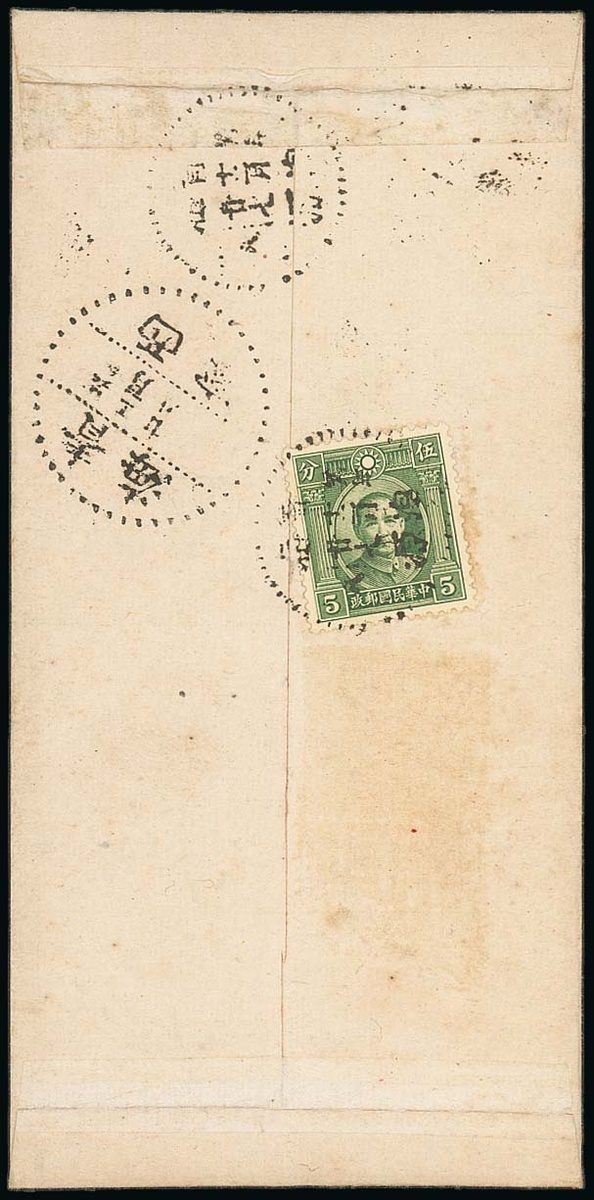 Huangyuan: 1937 (27 Dec.) envelope to Sining bearing, on the reverse, Sun Yat Sen 5c. green tied by a fine strike of Huangyuan dotted c.d.s. (type 6) with a second strike and large Sining (type 6) arrival c.d.s. (28.12), Clean and fine, with the original Muslim merchant's letter. Photo