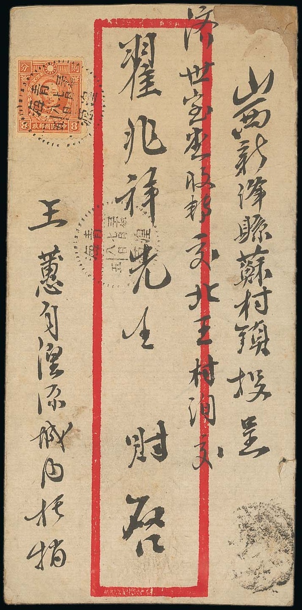 Huangyuan: 1941 (8 July) envelope to Xinjiang, Shansi bearing Martyrs 8c. orange tied by a good strike of Huangyuan dotted c.d.s. (type 6) with a second strike alongside, there is an indistinct arrival c.d.s. in the corner. Photo