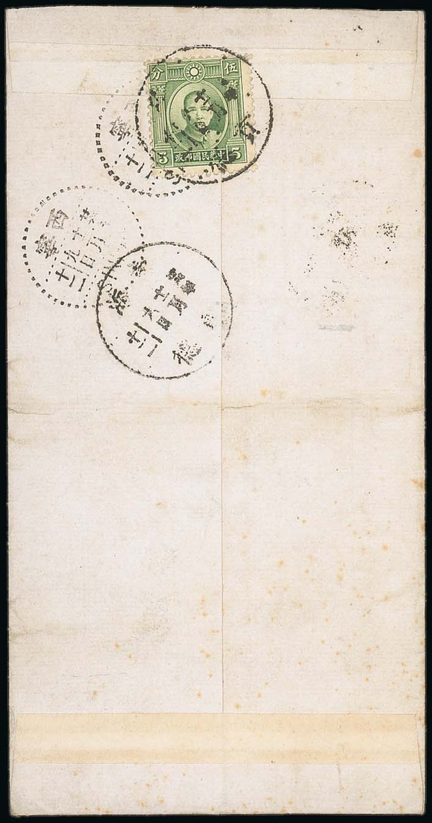 Kweite: 1937 (6 Dec.) envelope to Sining bearing, on the reverse, Sun Yat Sen 5c. green tied by a fine strike of Kweite c.d.s. with a second strike alongside, also two strikes of small Sining arrival dotted c.d.s. (type 6); light folding crease and with the original contents. Clean and fine. Photo