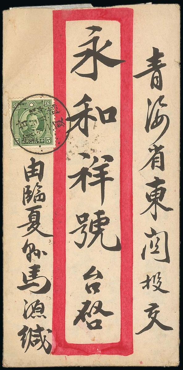 Linxia: 1935 (22 Mar.) envelope to Sining bearing Sun Yat Sen 5c. tied by Linxia c.d.s. and, on the reverse, a fine strike of the dotted Sining c.d.s. (type 6) (27.3) and predates the usual usage period. With the original enclosure between two Muslim merchants on pre-printed Sun Yat Sen portrait and political letterhead. Photo