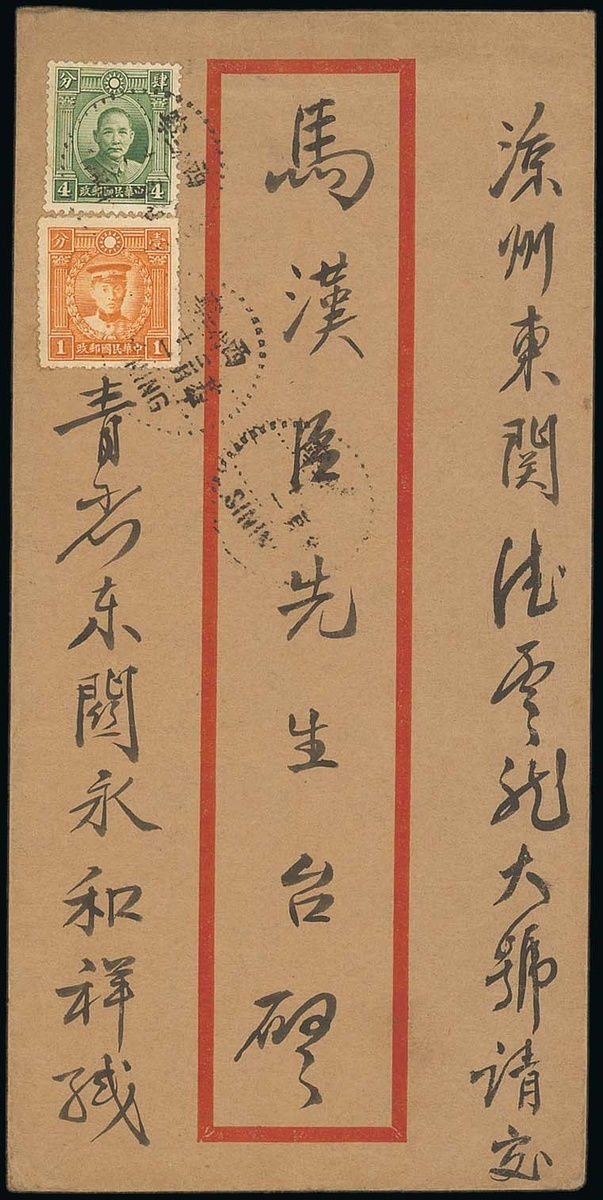 Sining: 1940 (11 Mar.) envelope to Liangchow bearing Martyrs 4c. and 1c. tied by Sining type 6, Chinese/English c.d.s. with a further strike alongside; without arrival c.d.s. but with the original merchant's letter. Photo