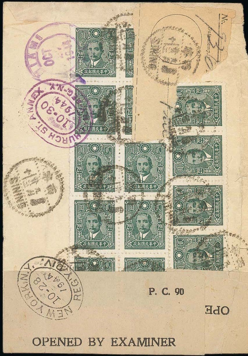 Sining: 1944 (23 Sept.) envelope registered to New York bearing, on the reverse, Sun Yat Sen Central Trust $2 blue-green (14) cancelled by Sining type 6 Chinese/English c.d.s. with a large fragment of the registered receipt, Indian censor seal and handstamp, Miami (27.10), New York (28.10) and Church St. Annex arrival (30.10), the address side with Sining registration label. Some soiling. Although air mail is not noted, pays postage $4, registration $6 and air mail by route 8 $18. Photo