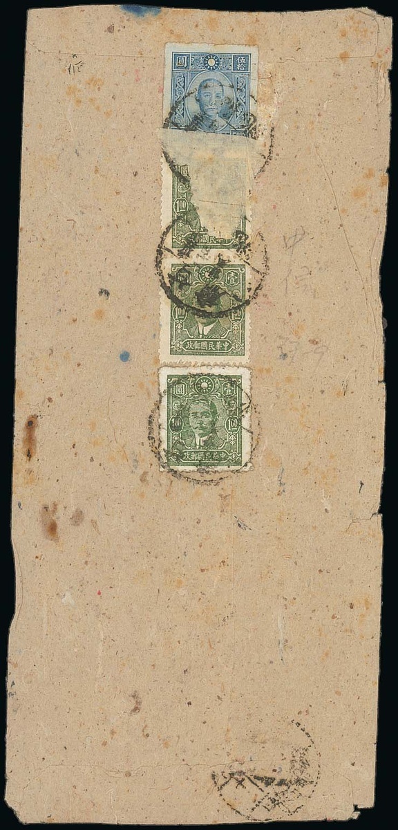 Lintao: 1946 (28 Feb.) envelope sent registered air mail to Nanking bearing, on the reverse, Sun Yat Sen $53 franking tied by Lintao c.d.s. with fragments of the registration receipt, the address side with another despatch c.d.s., black on bright blue Par Avion etiquette and Nanking arrival c.d.s. (7.3). Rare air mail from the Tibetan region of Kansu. Pays postage $20, registration $30 and air mail $3. Photo