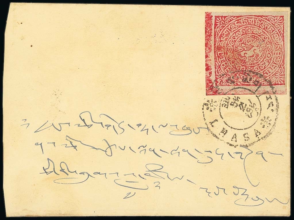 Undated envelope to Gyantse from the Vakil Office of the Nepalese Resident bearing 8t. carmine-pink [4] tied by a fine strike of the bilingual Lhasa type T42 postmark. The cover, addressed in Tibetan, "To Tsesupa, Gorkha Office (Nepalese Legation), Gyantse" from Tsering Doma, Soersok, Lhaden on the second day of the seventh month (Tibetan calendar). A good cover. Photo