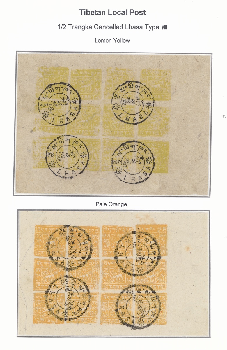 ½tr yellow in complete sheets of twelve cancelled by Lhasa type 8 postmark with setting 3 in pale orange and setting 4b in pale chrome. Good sheets. (2 sheets)