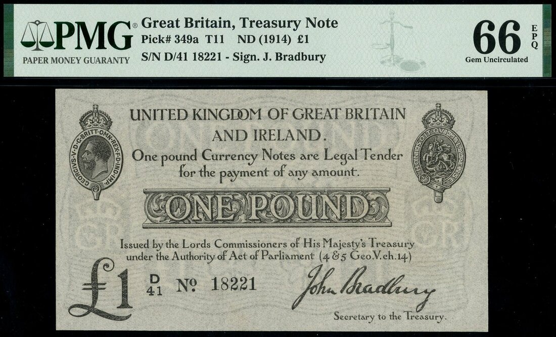 (EPM T11.1, Banknote Yearbook TR14a, Pick 349a), in PMG holder 66EPQ Gem Uncirculated, a De la Rue printing, with an Exceptional Paper Quality designation, also the highest grade ever given by PMG on the population report at the time of cataloguing, extremely rare!