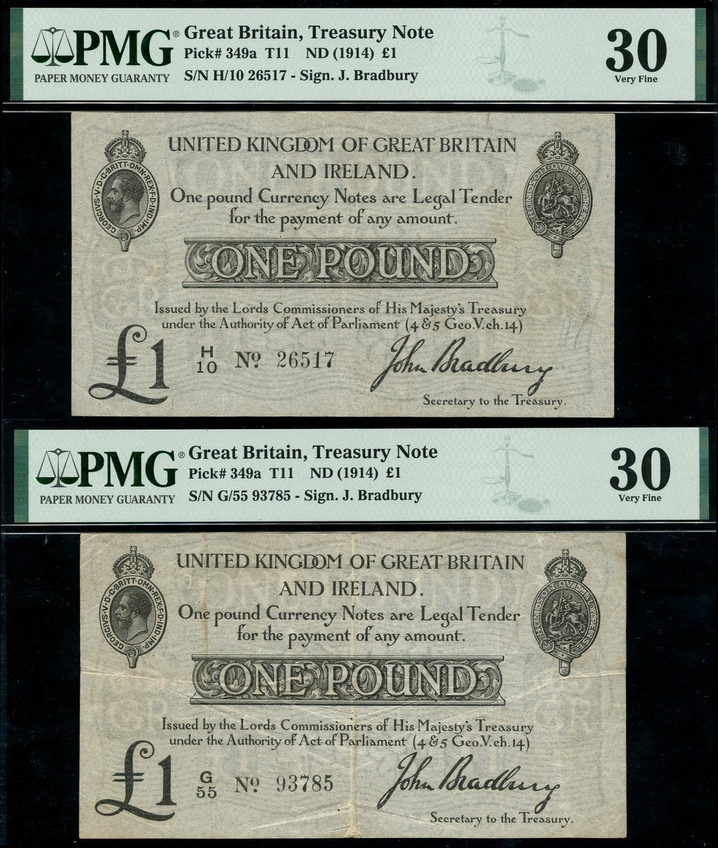 Treasury Series, John Bradbury, second issue £1, ND (23 October 1914), serial number prefixes G/55 and H/10, black and white, crowned head of George V top left, crowned vignette of Saint George and the dragon top right, value in black tablet at centre, pound symbol low left