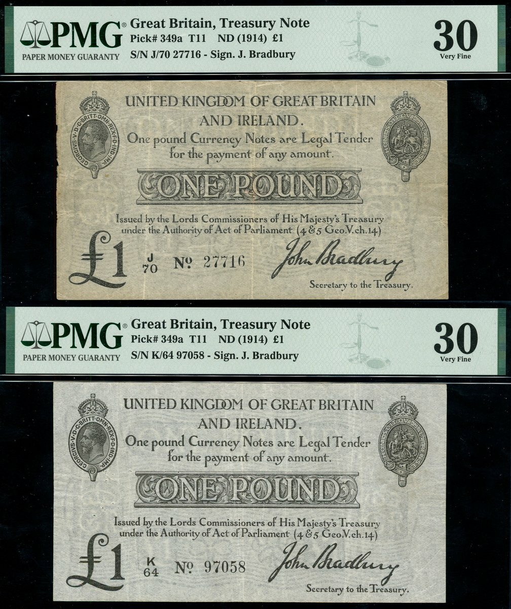 Treasury Series, John Bradbury, second issue £1 (2), ND (23 October 1914), serial number prefixes J/70 and K/64, black and white, crowned head of George V top left, crowned vignette of Saint George and the dragon top right, value in black tablet at centre, pound symbol low left