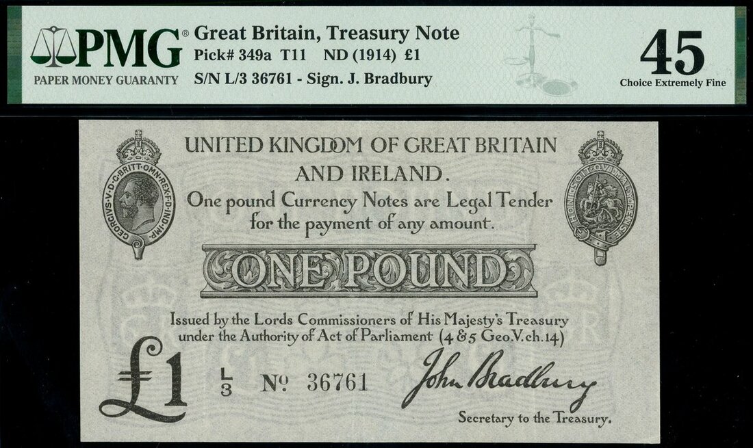 Treasury Series, John Bradbury, second issue £1, ND (23 October 1914), serial number L/3 36761, black and white, crowned head of George V top left, crowned vignette of Saint George and the dragon top right, value in black tablet at centre, pound symbol low left
