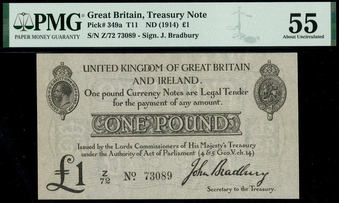 Treasury Series, John Bradbury, second issue £1, ND (23 October 1914), serial number Z/72 73089, black and white, crowned head of George V top left, crowned vignette of Saint George and the dragon top right, value in black tablet at centre, pound symbol low left