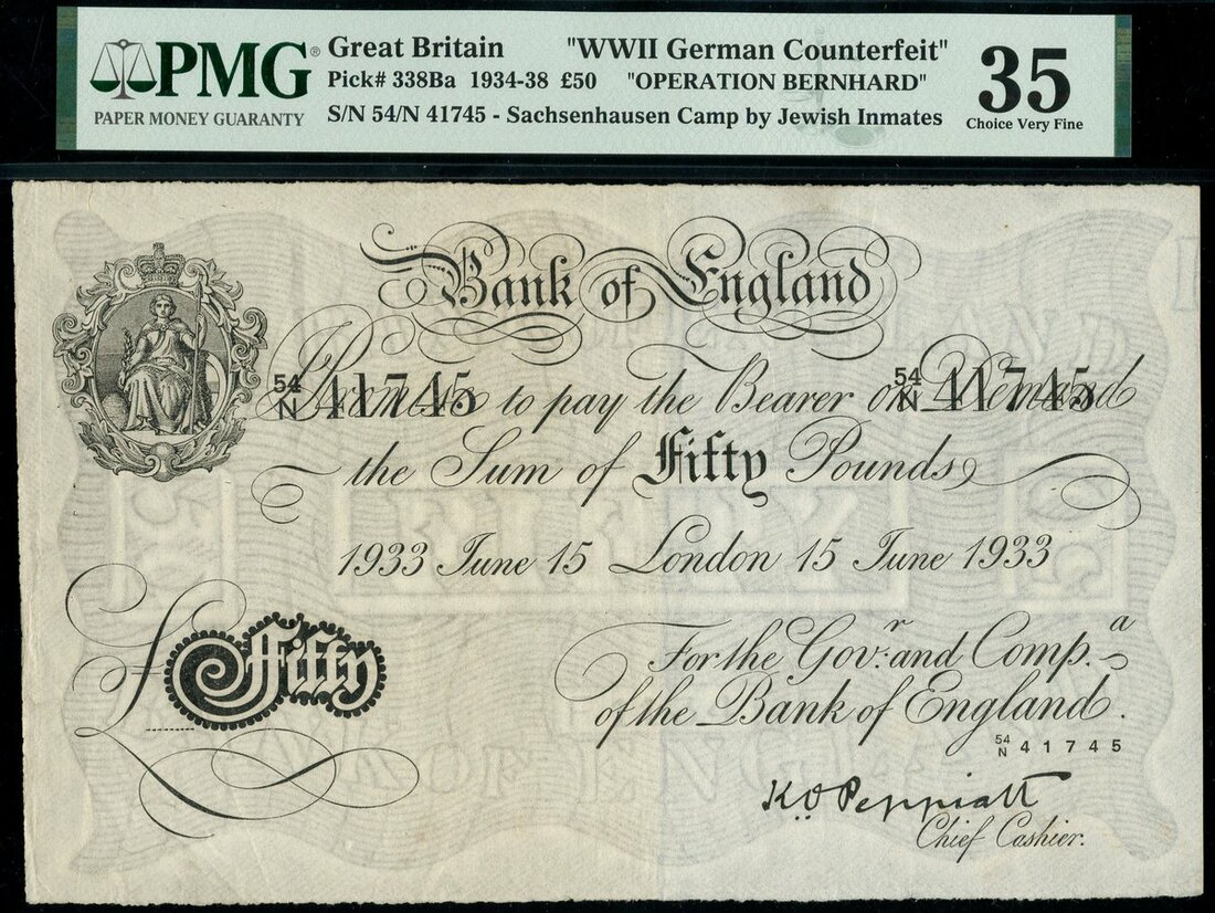 Operation Bernhard, K.O.Peppiatt (with Catterns date), Bernhard £50, London, 15 June 1933, serial number 54/N 41745, black and white, ornate crowned vignette of Britannia top left, value in black tablet low left