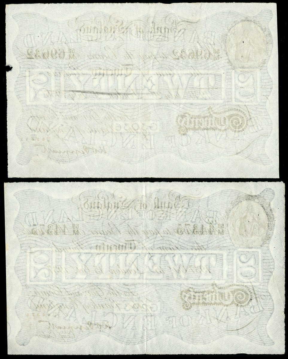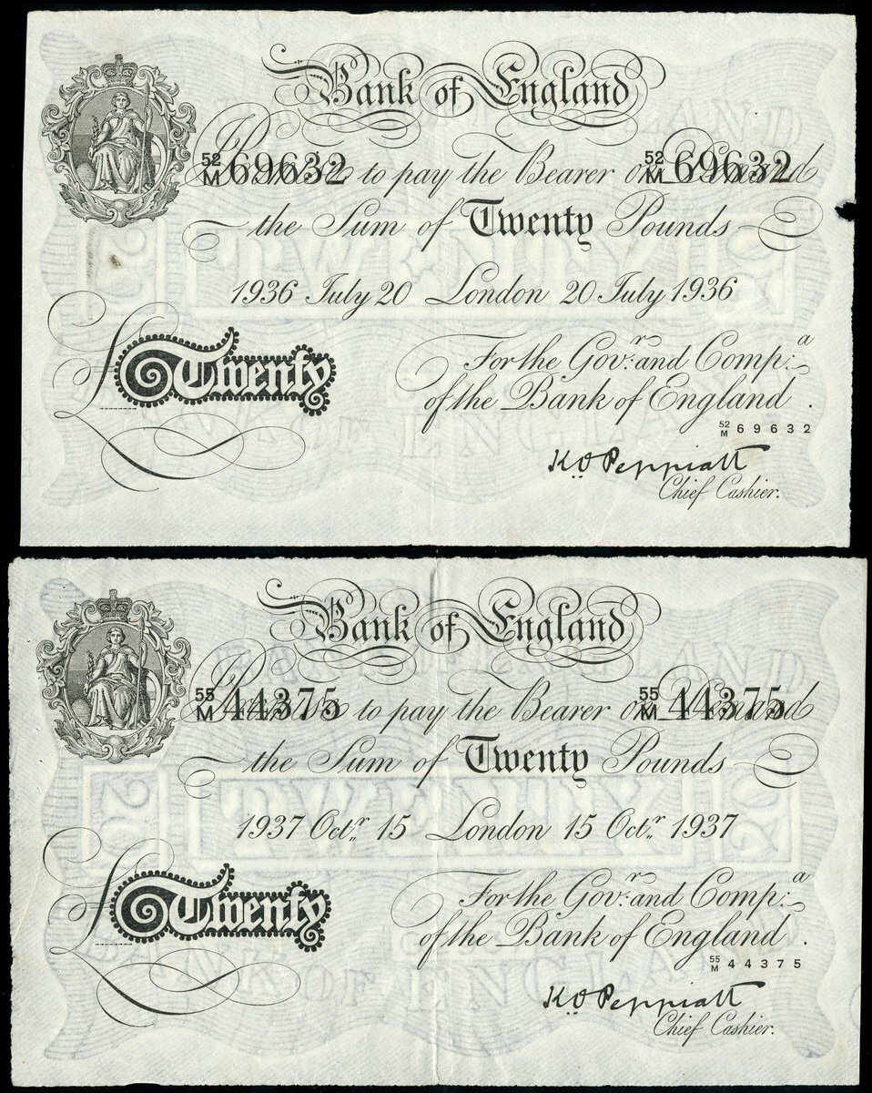 Operation Bernhard, K.O.Peppiatt, Bernhard £20 (2), London, 1936 and 1937, prefixes 52/M and 55/M, black and white, ornate crowned vignette of Britannia top left, value in black tablet low left