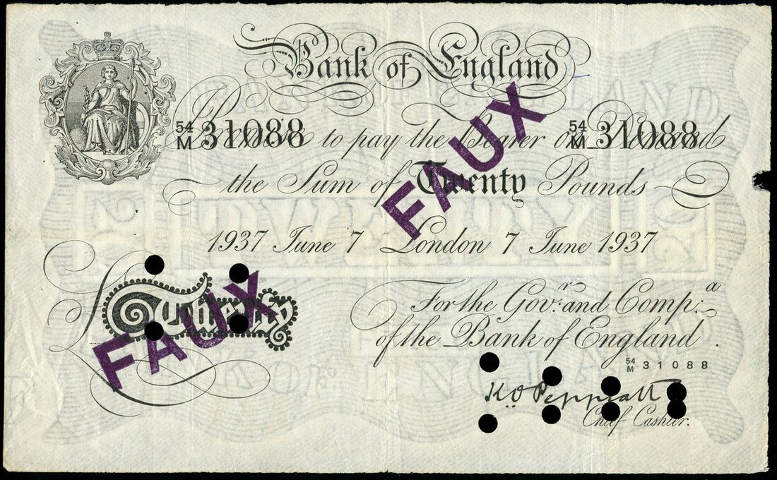 Operation Bernhard, K.O.Peppiatt, Bernhard £20, London, 7 June 1937, serial number 54/M 31088, black and white, ornate crowned vignette of Britannia top left, value in black tablet low left,