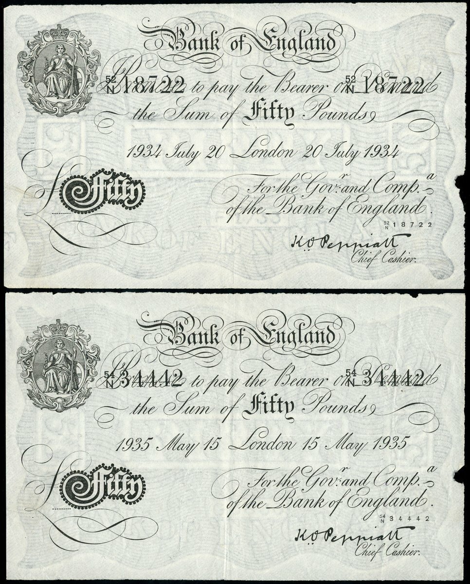 Operation Bernhard, K.O.Peppiatt, Bernhard £50 (2), London, 1934 and 1935, prefixes 52/N and 54/N, black and white, ornate crowned vignette of Britannia top left, value in black tablet low left