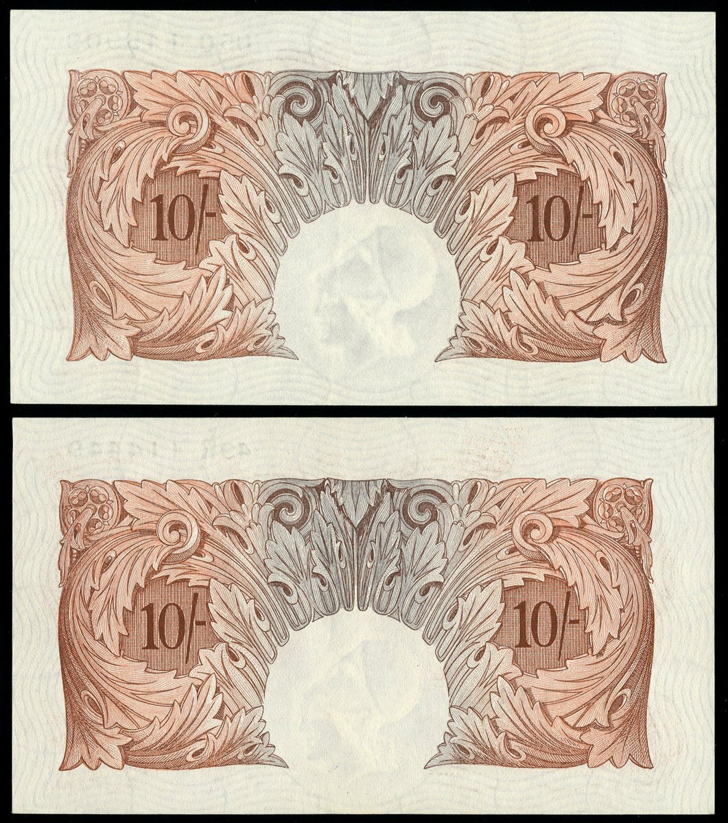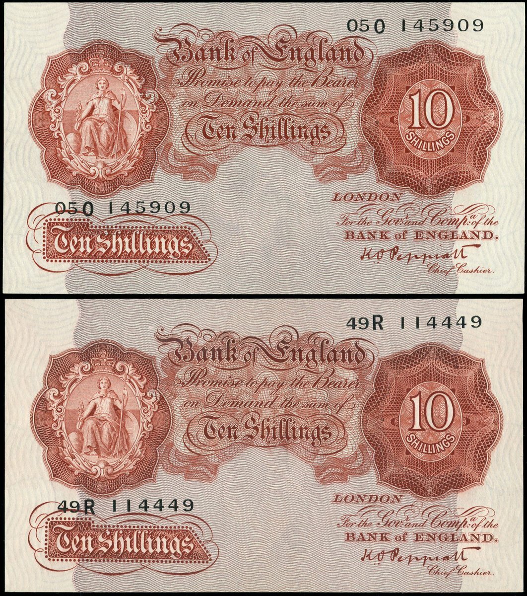 Bank of England, Kenneth Oswald Peppiatt (1934-1949), 10 shillings (2), ND (1934), serial number prefix 49R and 05O, red-brown, ornate crowned vignette of Britannia at left, value at right, reverse brown, value at left and right