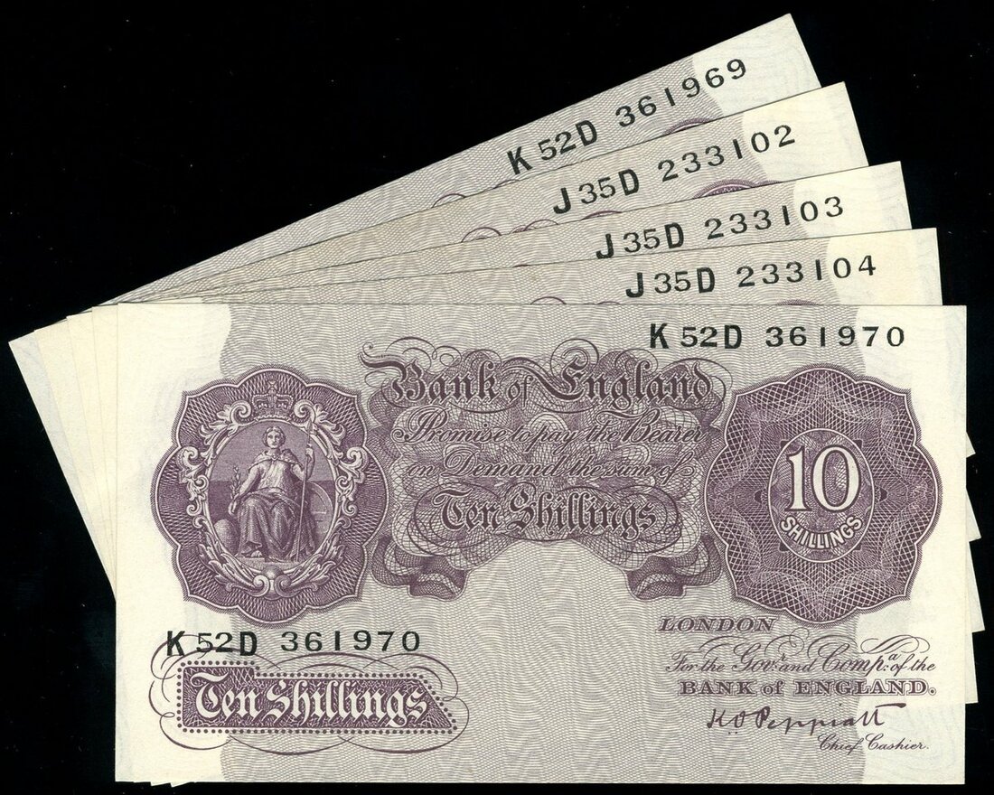 Bank of England, Kenneth Oswald Peppiatt (1934-1949), 10 shillings (5), ND (1940), serial number prefixes J35D (three consecutive) and K52D (two consecutive), mauve, ornate crowned vignette of Britannia at left, value at right, reverse brown, value at left and right