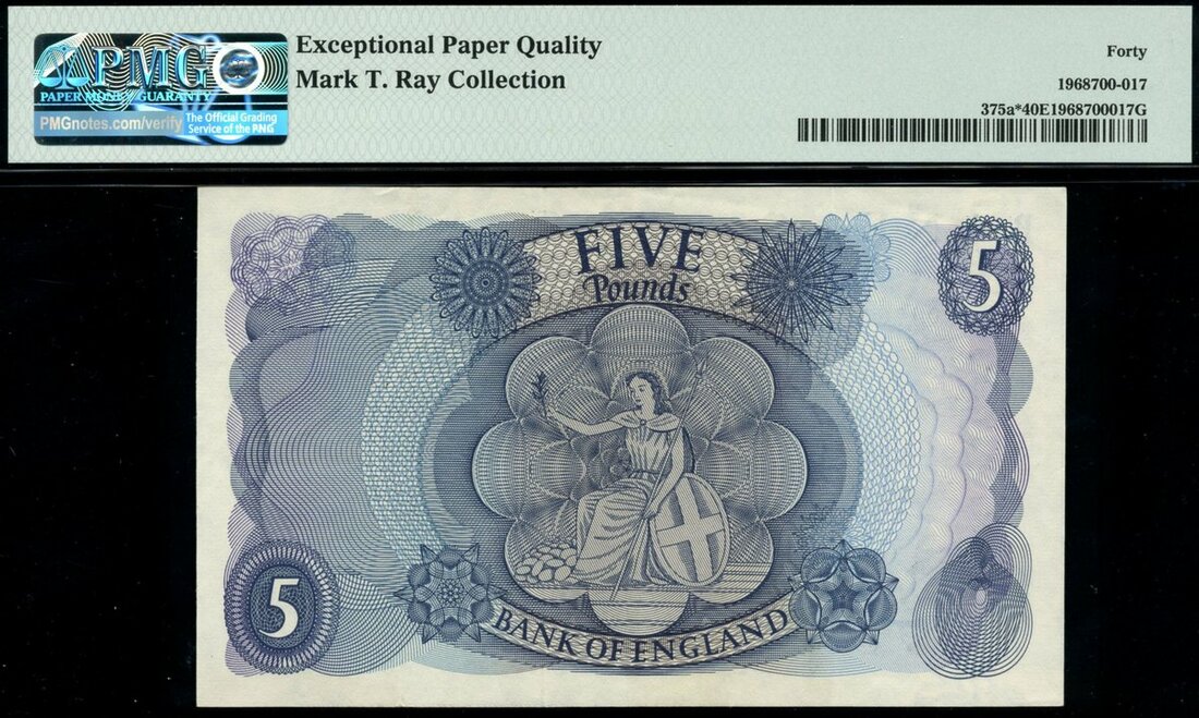Bank of England, Jasper Quintus Hollom (1962-1966), replacement £5, ND (1963), serial number M04 047617, blue and mauve, Elizabeth II at right, reverse blue, Britannia