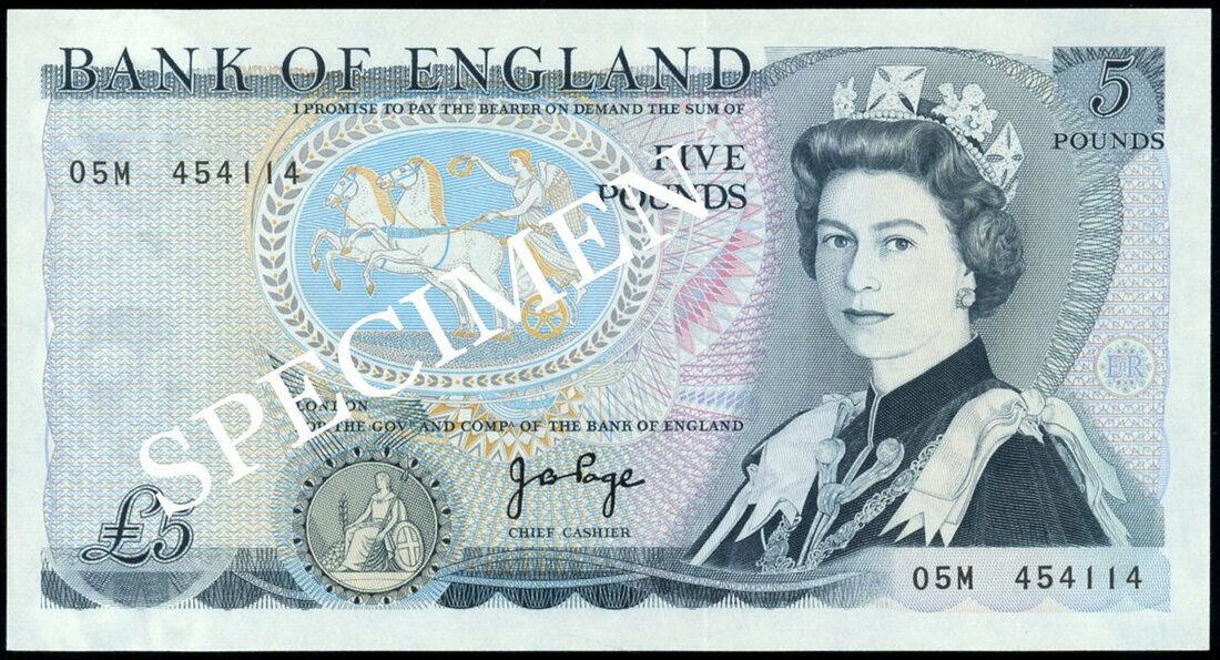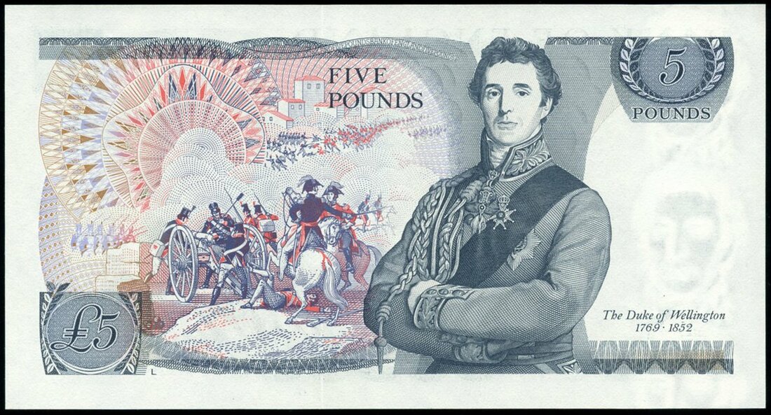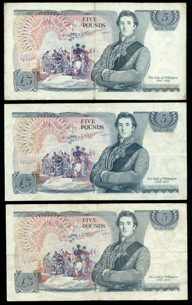 Bank of England, John Brangwyn Page (1970-1980), £5 (4), ND (1971), serial number prefixes M01 and M05, plus ND (1973) 01M and 05M blue and lilac and pale yellow-orange, Elizabeth II at right, Victory in biga at top left centre, Britannia below, reverse blue, the Duke of Wellington and the Battle of Fuentes de Onoro