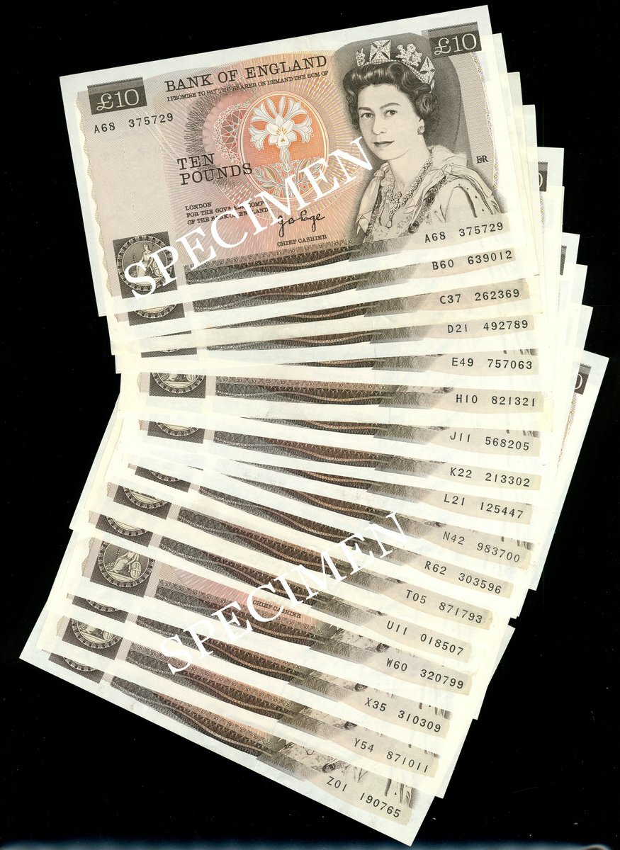 Bank of England, John Brangwyn Page (1970-1980), £10 (18), ND (1975), a complete run of serial number prefixes A through T, brown, Elizabeth II at right, lily at centre, reverse brown, Florence Nightingale and the hospital at Scutari in the Crimea, also David Somerset £10, ND (1980), a complete run of prefixes U through Z