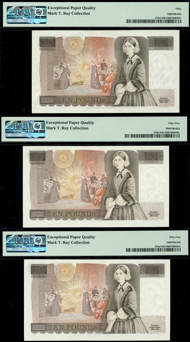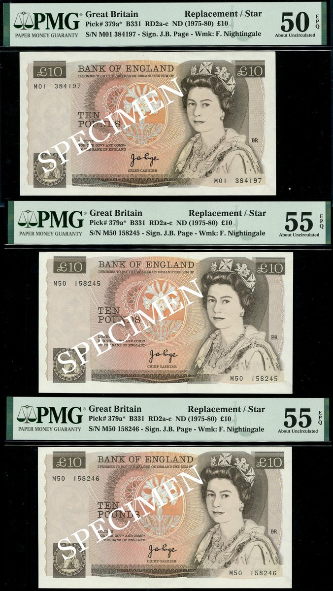 Bank of England, John Brangwyn Page (1970-1980), replacement £10 (3), ND (1975), serial number M01 384197, M50 158245/46 brown, Elizabeth II at right, lily at centre, reverse brown, Florence Nightingale and the hospital at Scutari in the Crimea