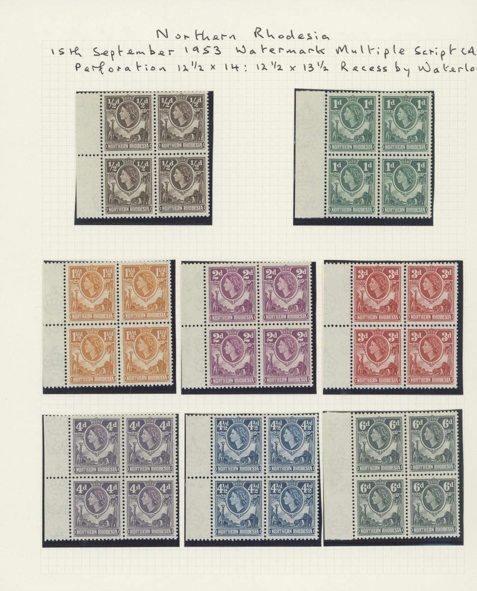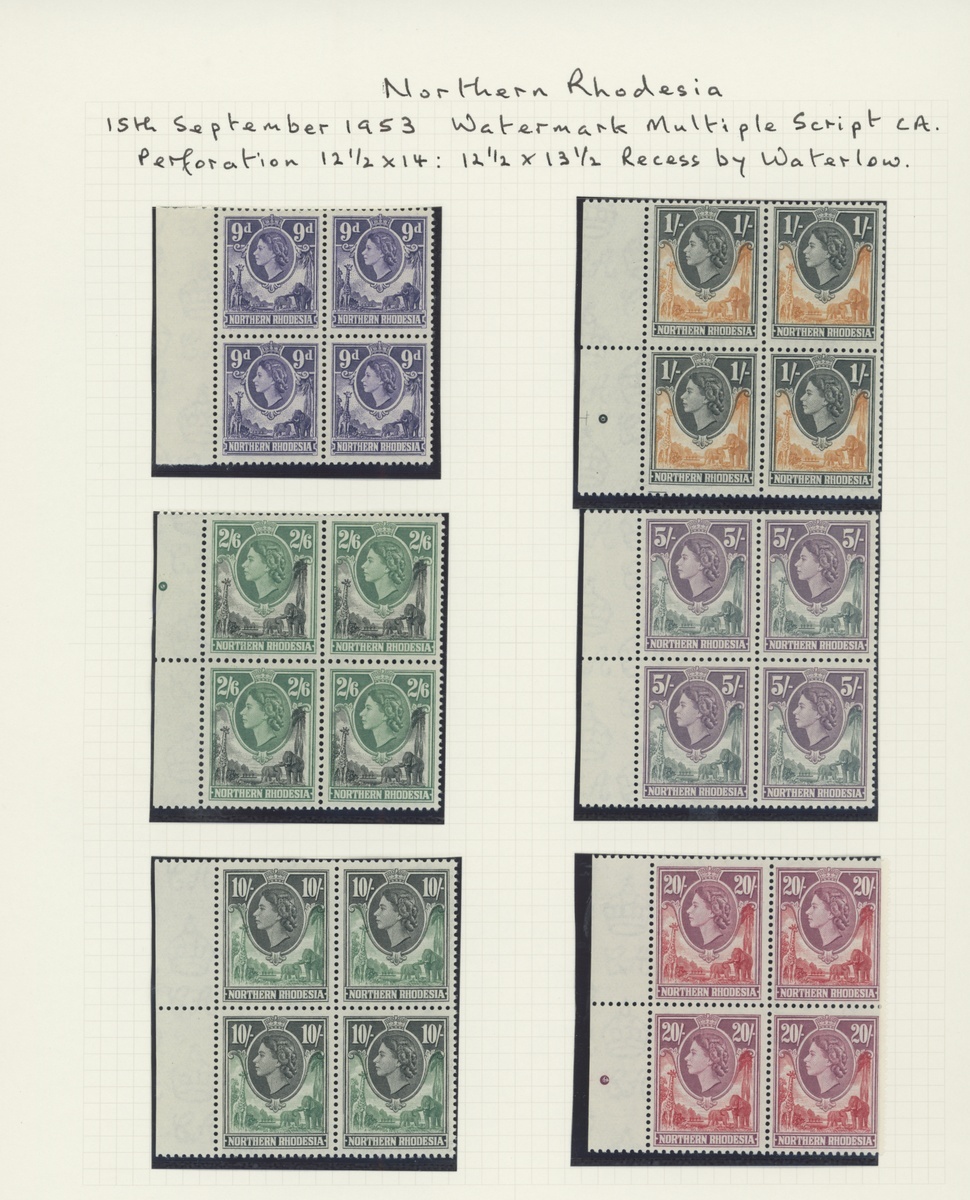 1953 Script set of fourteen to 20/- in marginal blocks of four, also the issued set of fourteen; unmounted mint and fine. S.G. 61-74, £450+