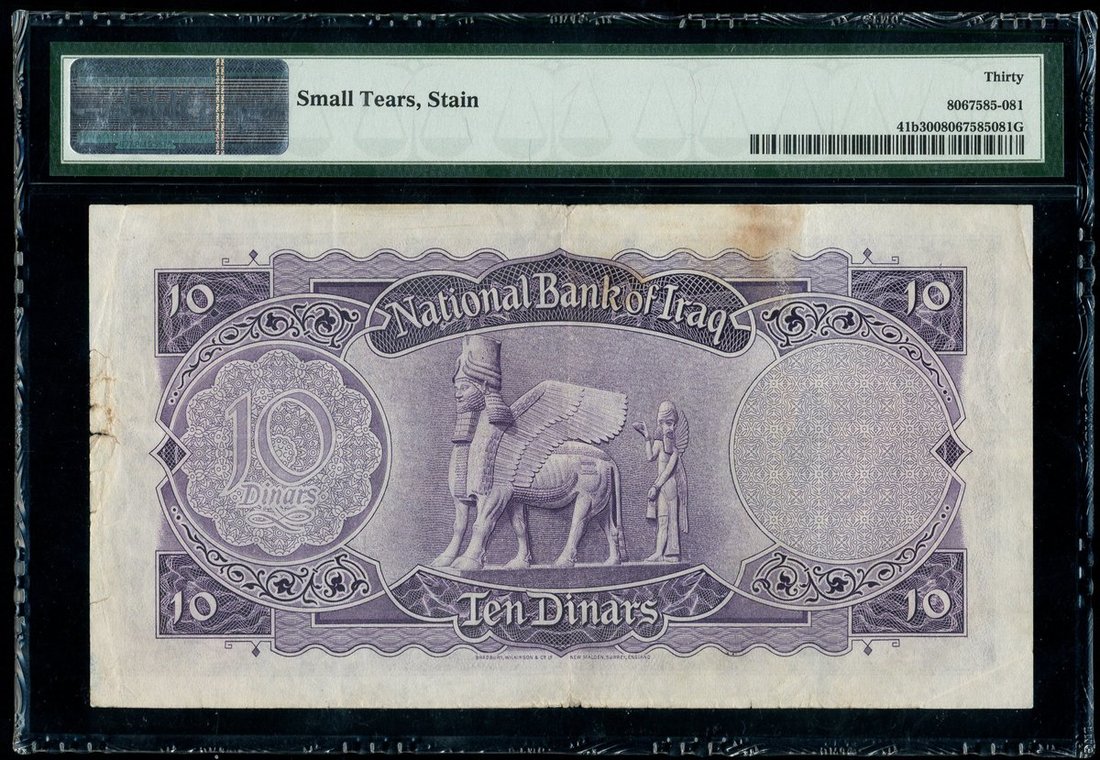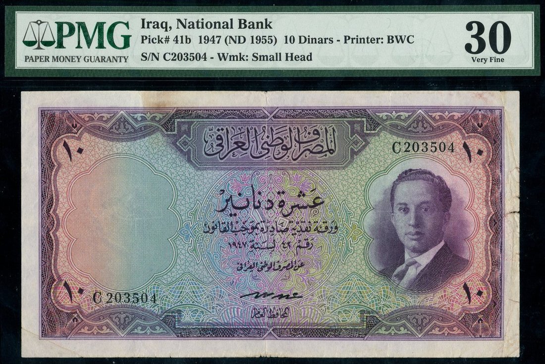 (x) National Bank of Iraq, 10 dinars, 1947 (ND 1955), serial number C203504, small head watermark type,