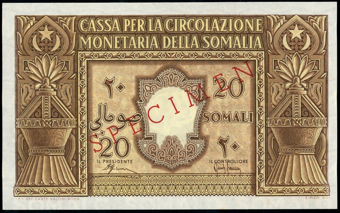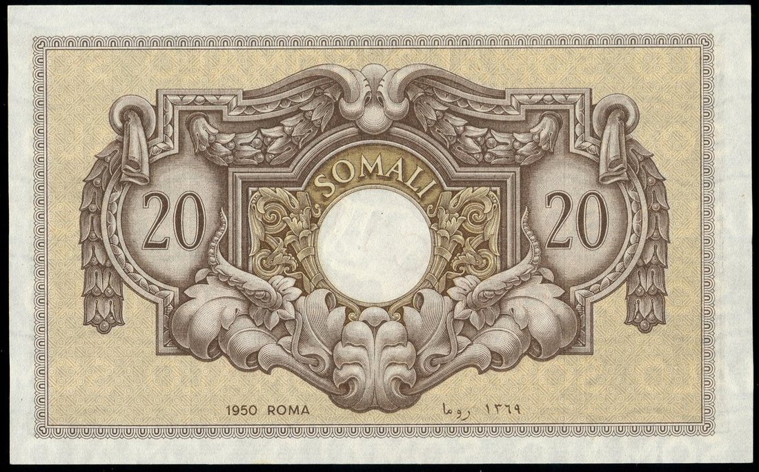 Cassa per la Circolazione Monetaria della Somalia, specimen 20 somali, 1950, zero serial number, yellow and brown, Somali fireplace at left and right, topped with stars and moons, values at centre right and left, reverse, value at left and right