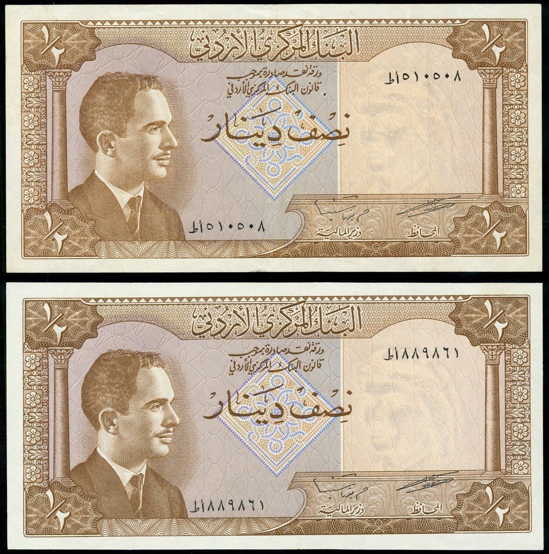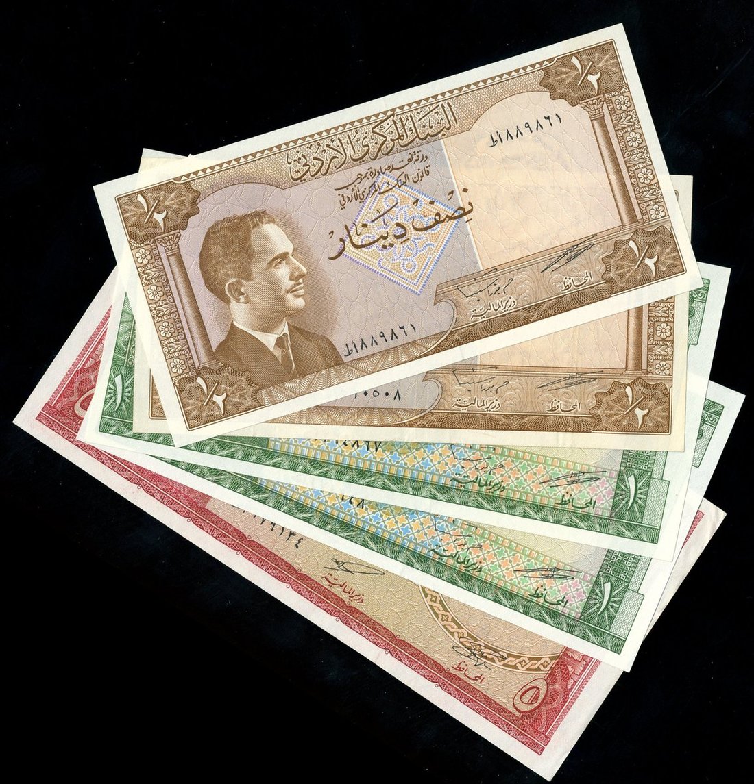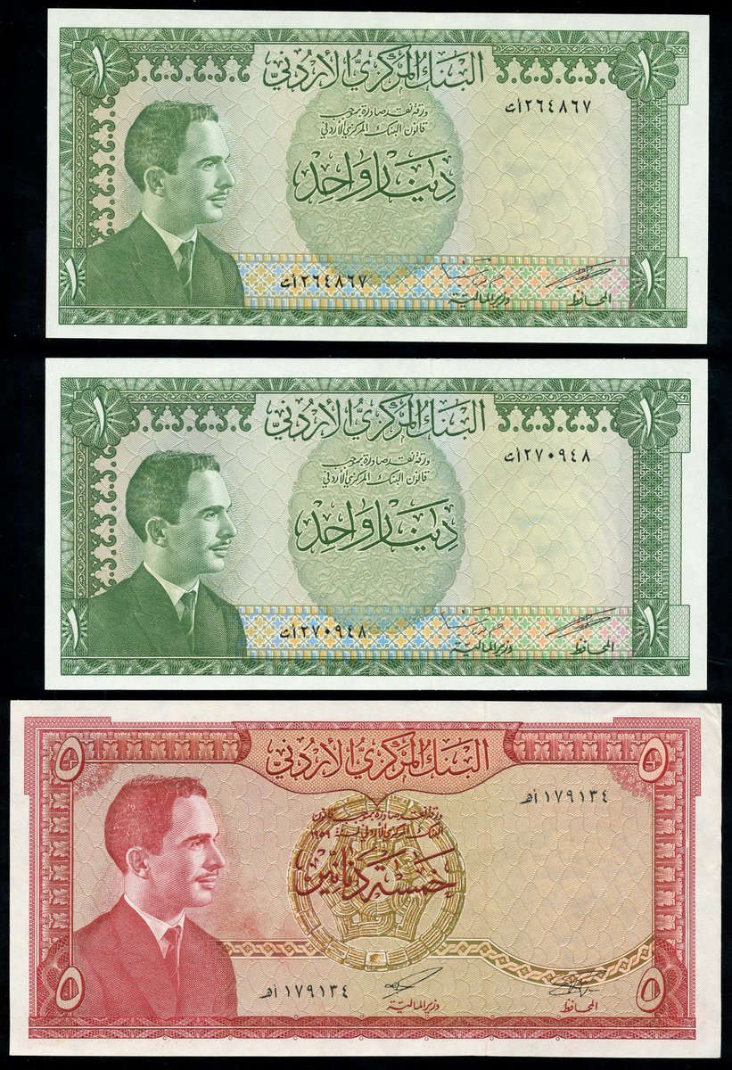 (x) The Hashemite Kingdom of Jordan, Central Bank, First issue, 1/2 dinar (2), 1 dinar (2), 5 dinar, 1959, brown, green and red respectively, all with King Hussein at left, 1/2 dinar and 1 dinar signature Shafik and Al Nabulsi, 5 dinars signature Al Majali and Al Salem,