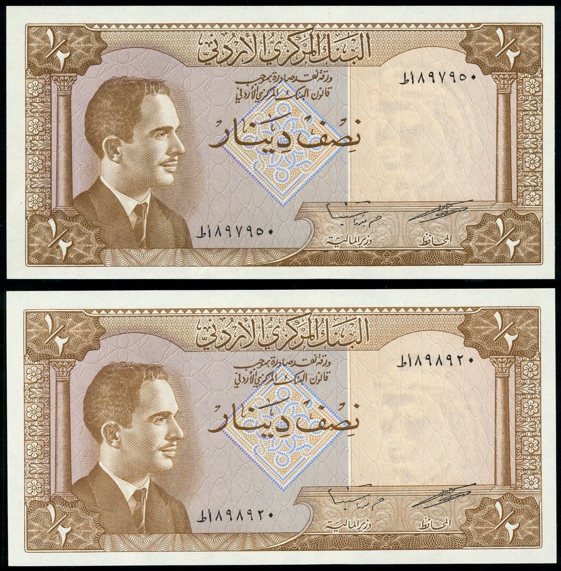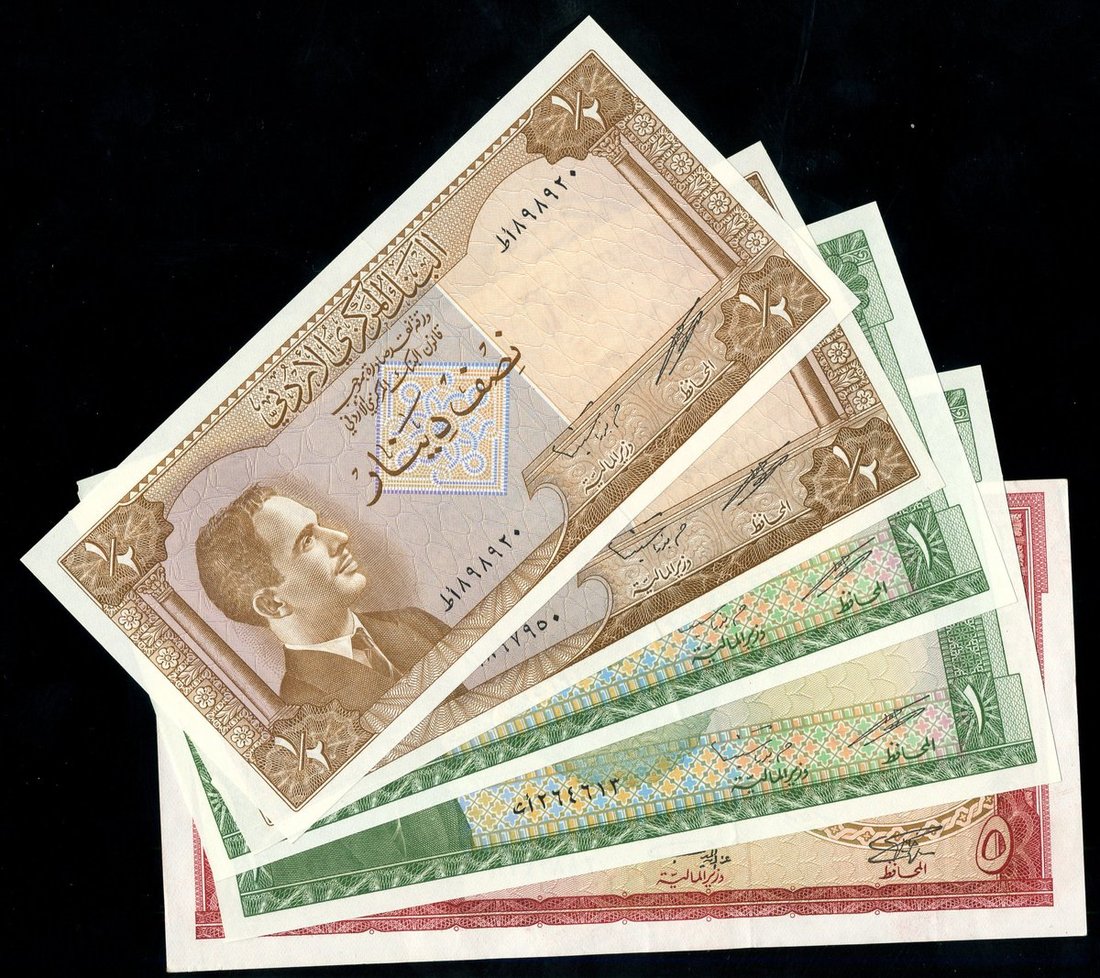 (x) The Hashemite Kingdom of Jordan, Central Bank, First issue, 1/2 dinar (2), 1 dinar (2), 5 dinar, 1959, brown, green and red respectively, all with King Hussein at left, 1/2 dinar and 1 dinar signature Shafik and Al Nabulsi, 5 dinars signature Al Majali and Al Salem,