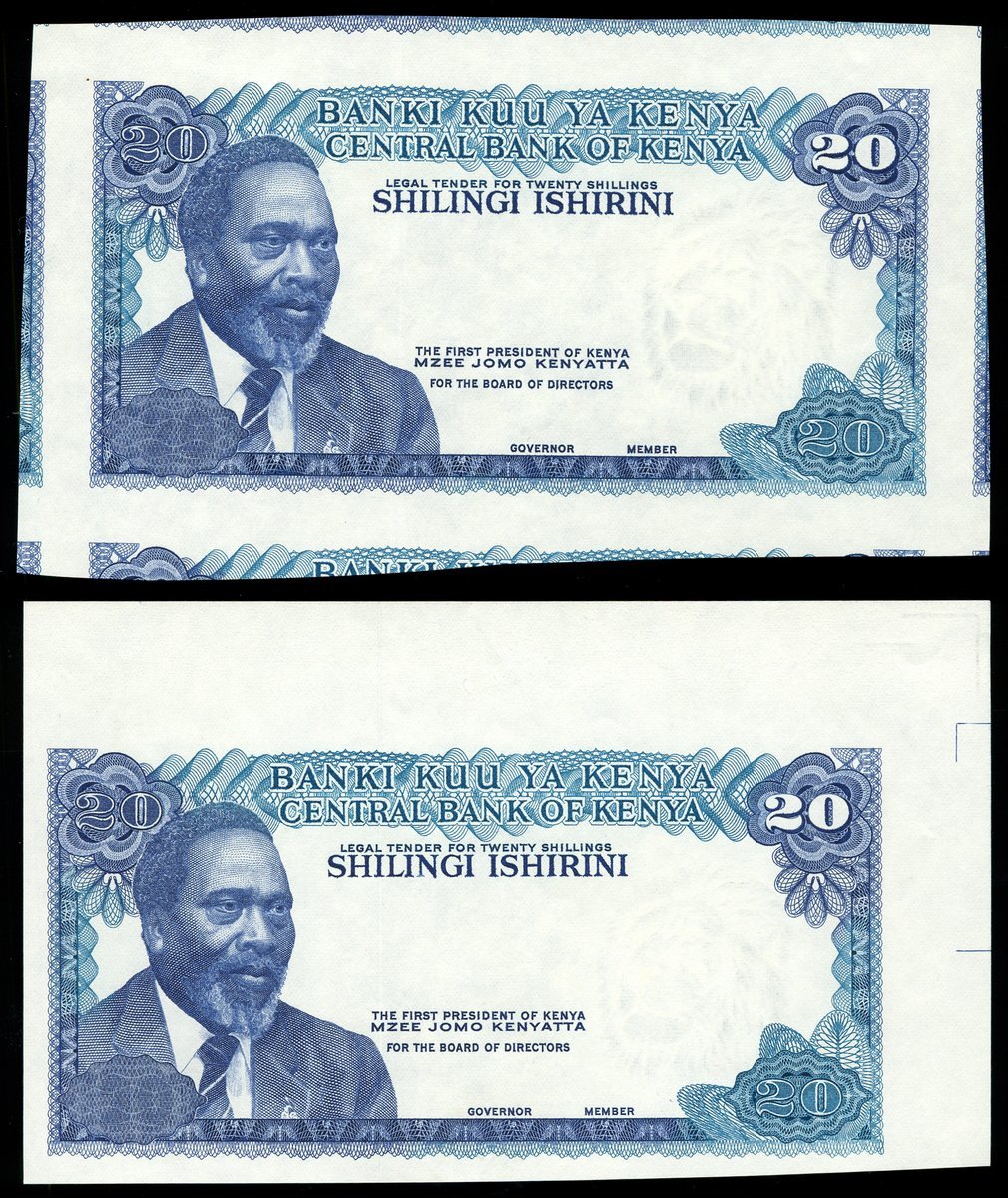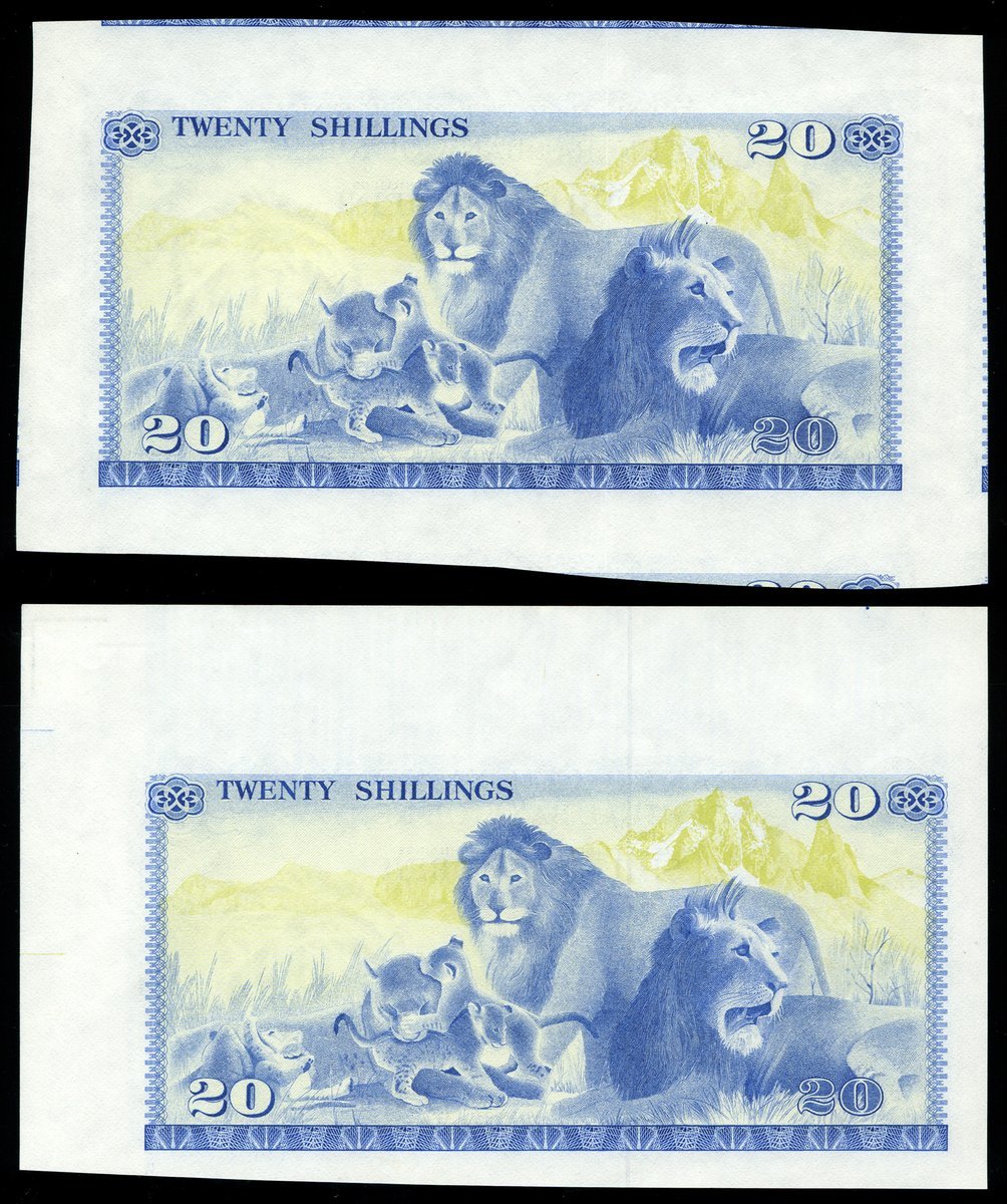(x) Central Bank of Kenya, progressive proofs for 20 shillings, ND (1974-77), both without obverse underprint,