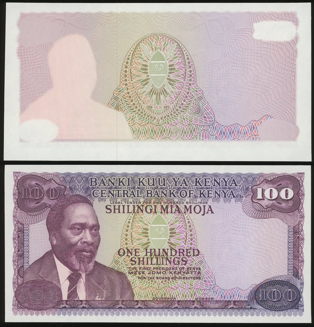 (x) Central Bank of Kenya, progressive proofs for 100 shillings (2), ND (1974-77), first obverse without overprint, second obverse fully printed, without serial numbers, signatures and dates, both reverses fully printed,